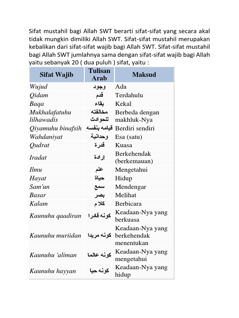 Sifat wajib bagi allah adalah sifat yang pasti ada pada allah. Inilah tabel latin arab arab dan arti dari 20 sifat wajib allah yang wajib umat islam ketahui. Sifat wajib dan mustahil bagi allah wajib diketahui oleh semua umat muslim yang mempunyai pikiran sehat dewasa serta mempercayai keberadaan allah beserta semua kesempurnaan yang dimilikinya. Sifat sifat wajib allah tidak dapat diserupakan dengan sifat sifat makhluk nya maka sifat allah wajib diyakini dengan akal wajib aqli dan berdasarkan al qur an dan hadits nabi saw.
