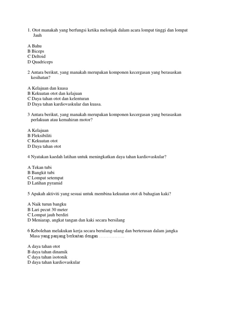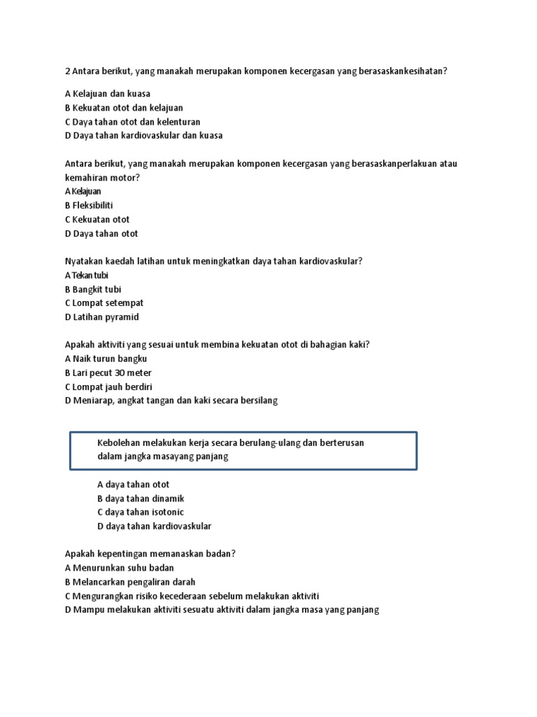 Aktiviti untuk membina daya tahan kardiovaskular. Menurut american college of sports medicine aktiviti aktiviti ini termasuk berjalan pantas berlari berbasikal berenang ski merentas desa melompat tali dan skating in line. Tahap kecergasan meningkat apabila keupayaan daya tahan kardiovaskular melebihi. Daya tahan kardiovaskular adalah komponen yang terpenting dalam profil fisiologi manusia. Sistem pernafasan untuk membekalkan oksigen kepada otot secara berterusan.