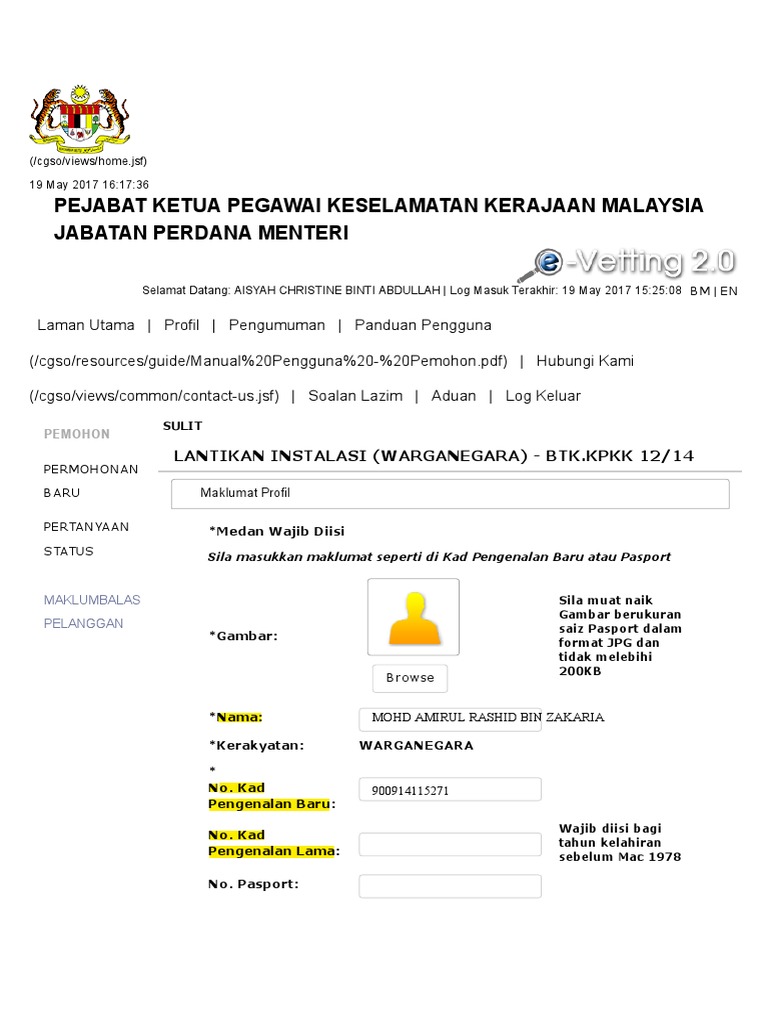 Manual pengguna sistem e vetting permohonan tapisan keselamatan spa pandangan pemohon.