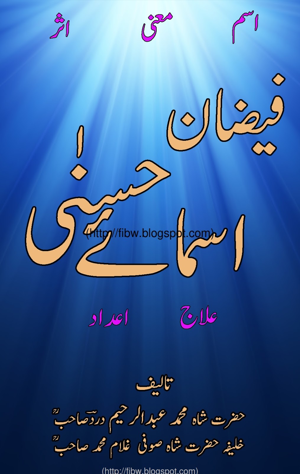 Anwaar e asmaul husna amliyat e qalandari is a collection of wazaif of asma ul husna by baba peer fazal shah qadri qalandari compiled by professor dr. In which all the prescriptions are perfect and accurate any male and female working perfectly by their purpose can be successful by placing the names of god in the worldly purposes if the prescription is correct author. Sharah asma ul husna urdu by hazrat muhammad idrees dahiri naqshbandi 6. Asma ul husna ali hussain shah 7.