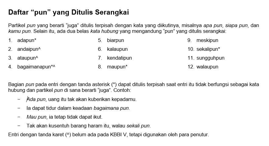 Ataupun atau atau pun. Kecuali untuk dua belas kata berikut pun harus ditulis serangkai dng kata yang mengikutinya. Kalau kedinginan kulit saya langsung njendol njendol sekaligus gatal gatal tapi itu semua nggak ada apa apanya kalau dibandingkan rasa gatal waktu lewat di depan sebidang tanah yang saya lewati hampir tiap pagi. Jika anda pergi saya hendak pergi. Kata ini kalau diartikan menjadi apa saja berbeda dengan kelompok kata yang lazim dianggap padu di atas.