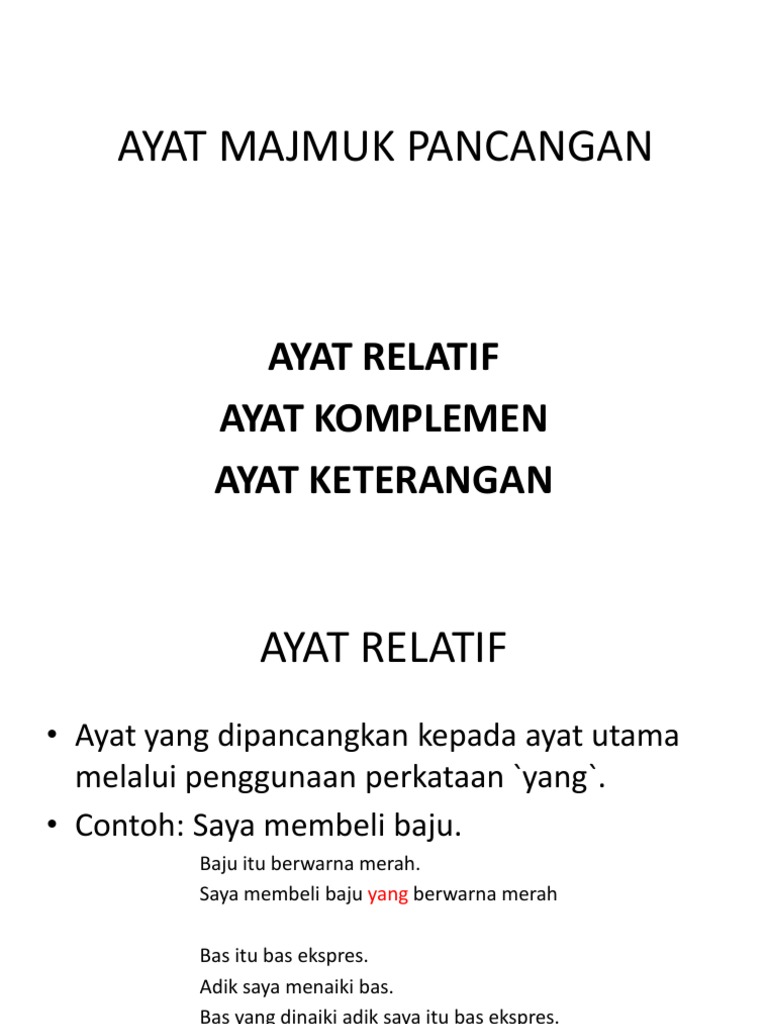 Ayat majmuk pancangan relatif yang. Terdapat tiga jenis ayat majmuk pancangan iaitu. Ayat majmuk gabungan terdiri daripada dua ayat atau lebih yang dijadikan satu dengan cara menggabungkan atau mencantumkan ayat tersebut dengan kata hubung seperti dan tetapi atau sambil dan sebagainya. Anda bisa mendownload atau mencetak gambar atau foto contoh ayat majmuk pancangan relatif di bawah ini. Ayat majmuk pancangan ialah ayat yang mengandungi satu ayat induk dan satu atau beberapa ayat kecil lain yang dipancangkan ke dalam ayat induk dengan menggunakan kata hubung pancangan.
