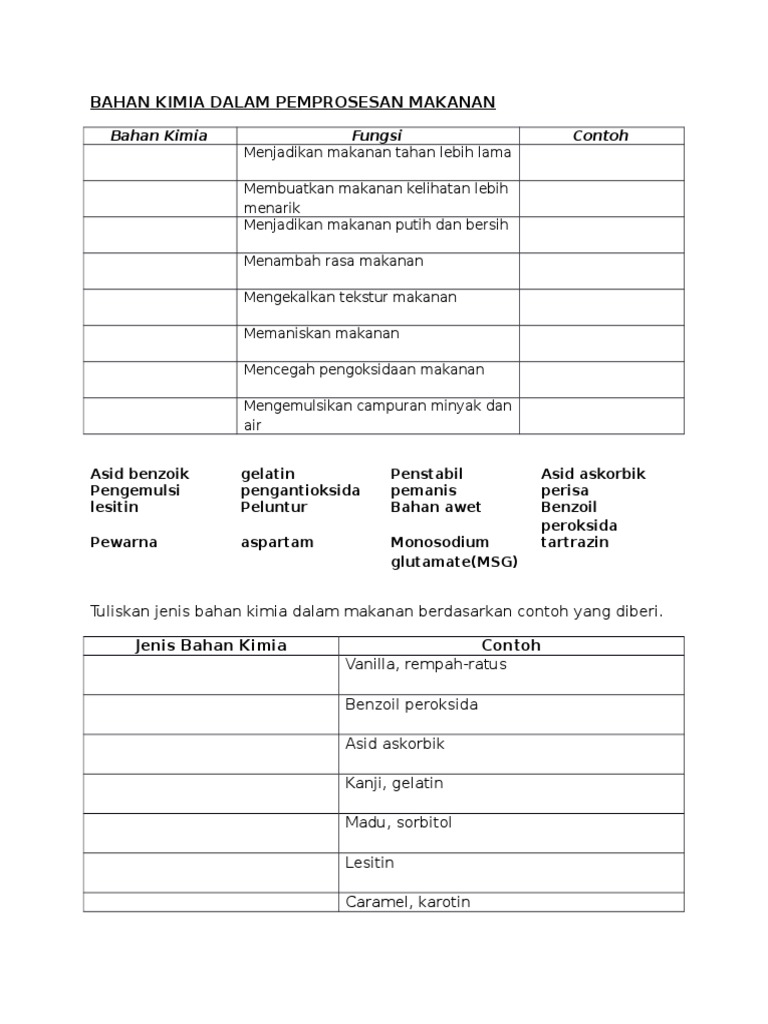 Bahan kimia dalam pemprosesan makanan. Zat aditif adalah bahan kimia yang dicampurkan ke dalam makanan yang bertujuan untuk meningkatkan kualitas makanan menambahkan kelezatan membuat makanan tampak lebih menarik dan mengawetkan makanan. Aditif makanan bermaksud apa apa bahan yang dimasukkan dengan sengaja ke dalam atau pada makanan dalam kuantiti kecil bagi mempengaruhi kualiti penyimpanan tekstur konsistensi rupa bau rasa kealkalian atau keasidan makanan tersebut ataupun secara tidak langsung semasa pemprosesan penyimpanan atau pembungkusan. Bahan kimia untuk makanan yang sesuai peruntukannya pada makanan apabila digunakan sesuai aturan bukan merupakan ancaman bagi tubuh kita. Melalui pembelajaran ini pelajar dapat menerangkan tujuan pemprosesan makanan dan menyatakan bahan kimia yang digunakan dalam pemprosesan makanan.