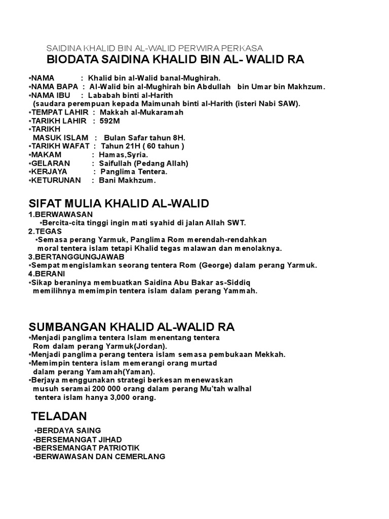 Biodata khalid bin al walid. Khalid ibn walid r a 592 642 also known as sword of allah saifullah. بسيف الله المسلول bermaksud pedang allah yang terhunus atau pedang allah adalah antara panglima tentera arab yang. Khalid bin al walid atau khalid ibni al walid 1 julai 592 1 oktober 642 bahasa arab. Beliau mempunyai pertalian yang agak rapat dengan nabi muhammad s a w kerana ibunya dan isteri rasulullah s a w maimunah binti al harith merupakan saudara kandung.