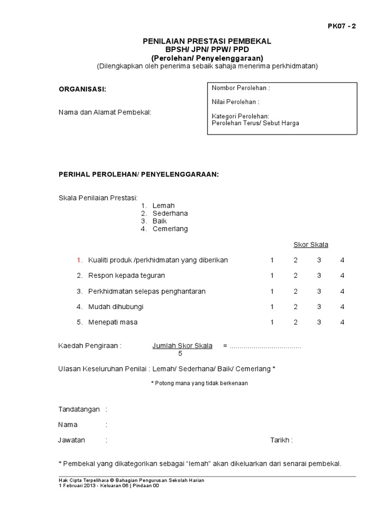 Borang Penilaian Prestasi Pembekal Pk07 2