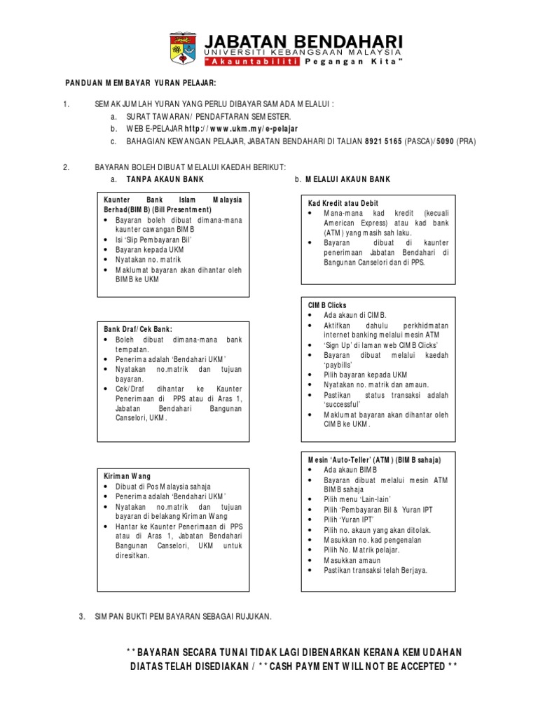 Cara bayar yuran ukm. Tarik diri tangguh pengajian 2 10. Dasar pembayaran semula. Terdapat beberapa cara yang boleh dilakukan dan kami akan terangkan satu persatu. Panduan untuk pelajar baru ukm semasa membuat pembayaran yuran melalui kaunter bank islam malaysia berhad bimb pembayaran yuran oleh pelajar ukm boleh dibuat melalui mana mana 88 cawangan.