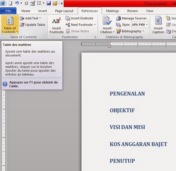 Apa itu table of contents. Masih ada lagi yang membuat isi kandungan secara manual di mana amat menyusahkan dan lambat sebenarnya. 3 jenis heading itu ditempatkan pada posisi yang berbeda heading 1 letaknya ada di posisi paling atas heading 2 berada di bawah heading 1 sedangkan heading 3. Sebelum nie aku hanya guna word nie sekadar buat dokumen ringkas aje tapi bila sambung belajar nie aku mula terpaksa banyak guna word untuk membuat tugasan.