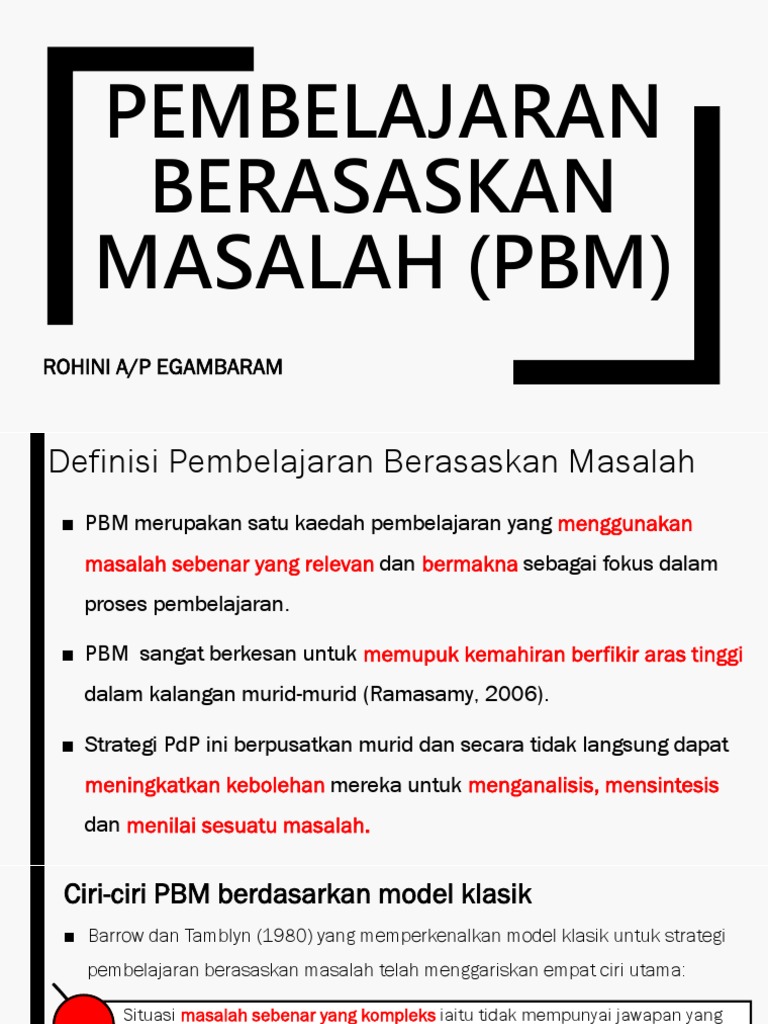Pelaksanaan berperingkat bermula daripada penyediaan bilik kelas susunatur dan keperluan fizikal dalam bilik darjah abad 21 kemudian diteruskan dengan penyediaan rancangan mengajar dan pelaksanaan p p abad 21. Pembelajaran abad 21 merupakan isu pendidikan paling trending di malaysia untuk tahun 2015 hingga tahun 2016 ini. Dalam pbm penemuan masalah adalah langkah pertama dalam proses pembelajaran. Pbm dikatakan dapat membantu meningkatkan kefahaman pelajar terhadap pembelajarannya dan menjadikan pembelajaran pelajar lebih bermakna.
