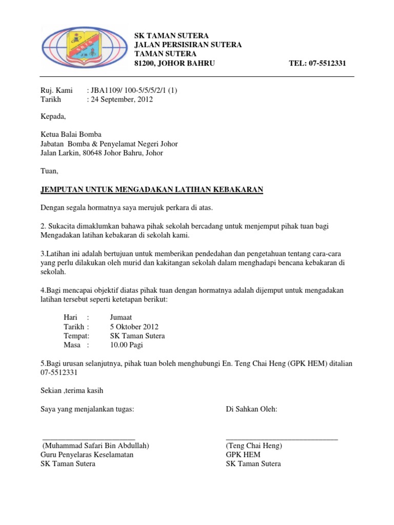 Contoh Surat Jemputan Kepada Bomba Untuk Latihan Kebakaran