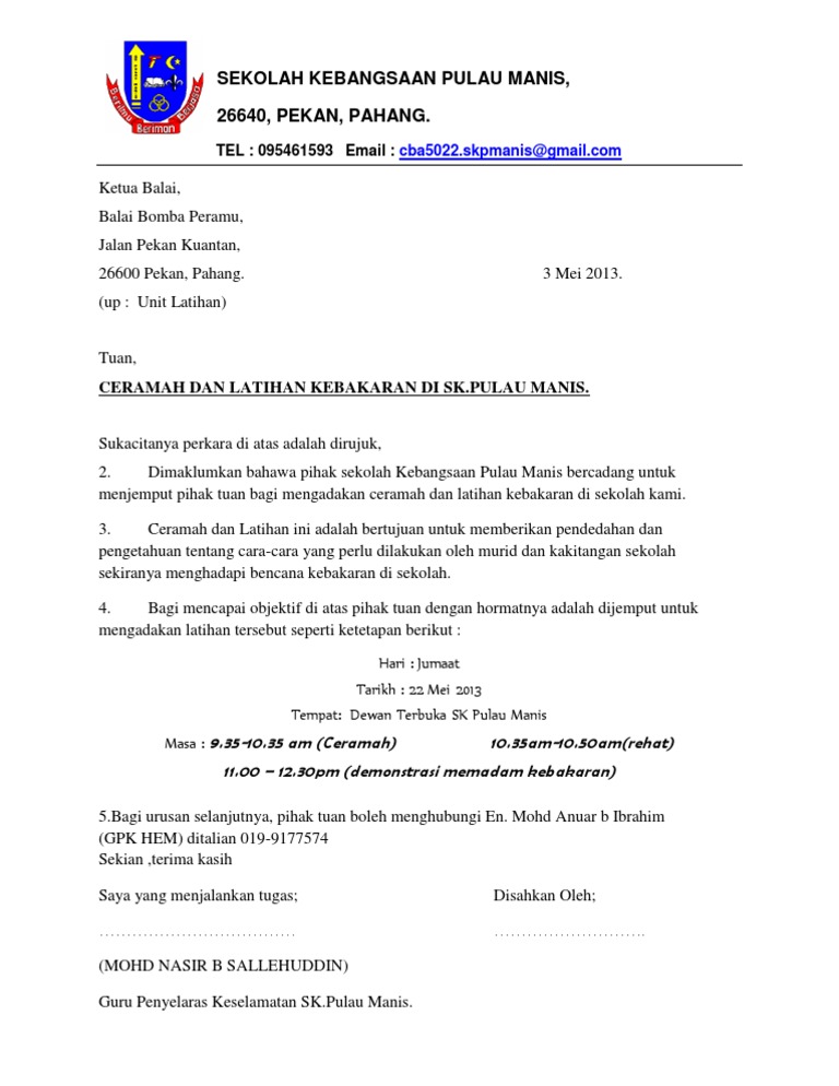 Lampiran a aturcara program ceramah latihan kebakaran dan keselamatan smk sri sadong 2014 tarikh. Sabtu perlaksanaan latihan kebakaran dan ceramah 9 45 pelajar dan guru mengambil tempat di dewan 10 00 bacaan doa 10 05 kata aluan pengerusi 10 15 ceramah oleh. Contoh surat jemputan penceramah april 4 about me. Academia edu is a platform for academics to share research papers.