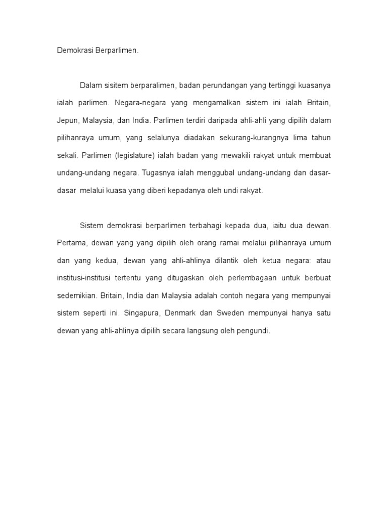 Selaras dengan peredaran masa beberapa pindaan perlembagaan dibuat untuk menyesuaikan sistem pentadbiran dengan perkembangan politik semasa. 1 1 keunikan malaysia yang mengamalkan sistem demokrasi berperlimen dan raja berpelembagaan akan akan dikupas melalui beberapa aspek iaitu konsep demokrasi berparlimen struktur parlimen malaysia sistem demokrasi di malaysia ciri ciri demokrasi berparlimen perlembagaan keluhuran perlembagaan kepentingan perlembagaan ketertinggian perlembagaan malaysia pindaan perlembagaan konsep raja. Metodologi kajian kajian yang dilaksanakan ini berbentuk kajian keperpustakaan rujukan atas talian data daripada suruhanjaya pilihan raya malaysia dan hasil kajian kajian lepas. Malaysia merupakan sebuah negara demokrasi berparlimen yang mengamalkan konsep pengasingan kuasa.