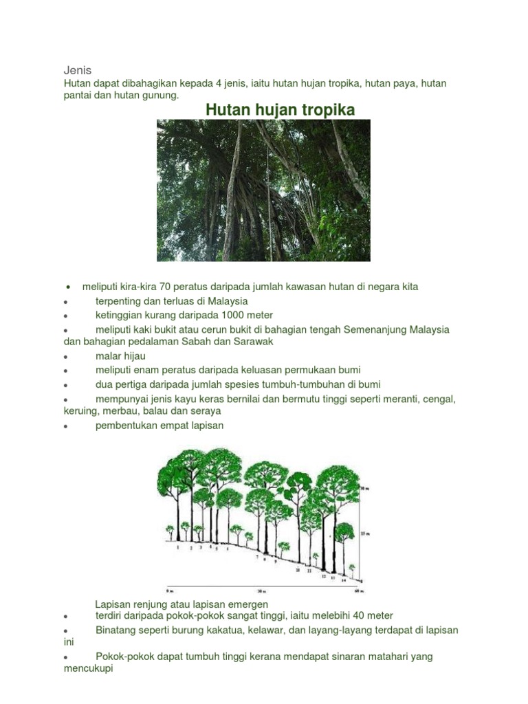 Empat lapisan hutan hujan tropika. Hutan hujan tropika adalah hutan yang paling luas dan terpenting di malaysia. Dalam hutan hujan terdapat empat lapisan tumbuhan yang berlainan masing masing dengan persekitaran yang berbeza yang menyokong spesies yang berlainan. Hutan hujan tropika menpunyai beberapa ciri yang unik antaranya ilah pembentukan empat lapisan yang nyata lihat rajah 1 1 lapisan teratas yang dikenal sebagai renjung atau emergen terdiri daripada pokok pokok yang sangat tinggi iaitu melebihi 40 meter pokok pokok ini tumbuh tinggi untuk mendapatkan sinaran matahari yang mencukupi pokok pokok ini menpunyai akar banir lihat foto 2 yang. Hutan hujan tropika tumbuh dikawasan yang ketinggian kurang daripada 1200 m hutan ini tumbuh.