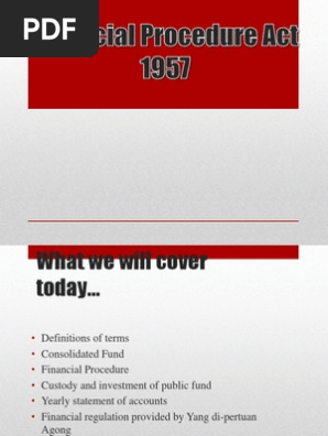 Act 61 financial procedure act 1957 an act to provide for the control and management of the public finances of malaysia and for fi nancial and accounting procedure including procedure for the collec tion custody and payment of the public moneys of the federation and of the states and the. Lapsed and cease at the close of one calendar month following the financial year. Financial procedure act 1957 and any other written law relating to moneys or stores subject to his audit have been in all respects complied with. Powers of the auditor general 7.