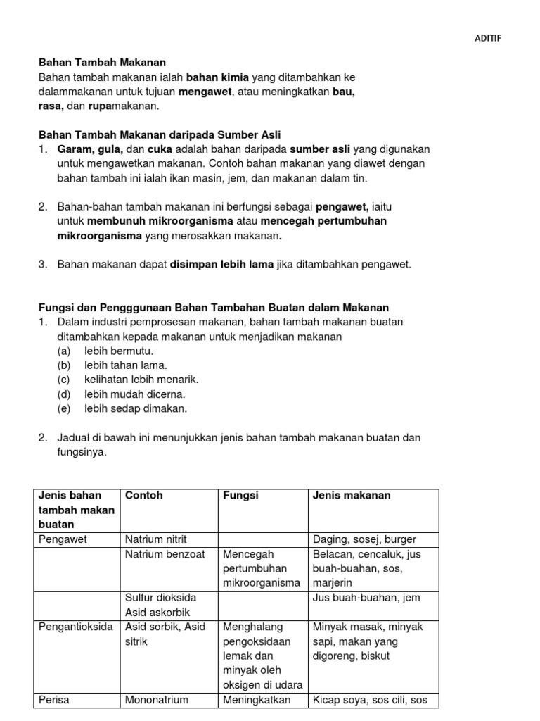 Fungsi bahan kimia dalam pemprosesan makanan. Bahan pengawet adalah bahan kimia yang dapat mencegah atau menghambat proses fermentasi pembusukan pengasaman atau peruraian lain terhadap makanan yang disebabkan oleh mikroorganisme sehingga makanan tidak mudah rusak atau menjadi busuk bahan pengawet bersifat karsinogen untuk itu batasan penggunaan bahan pengawet sebaiknya sesuai dengan peraturan menteri kesesehatan no. 2 zat aditif sintetik dari bahan kimia yang memiliki sifat serupa dengan bahan alami yang sejenis baik susunan kimia maupun sifat fungsinya seperti amil asetat dan asam askorbat. Pengertian zat aditif pada makanan sifat macam dampaknya. Namun tanpa pemantauan dan penguatkuasaan dari pihak berkuasa akan mewujudkan suasana yang tidak sihat akibat penggunaan yang tidak mengikut peraturan.
