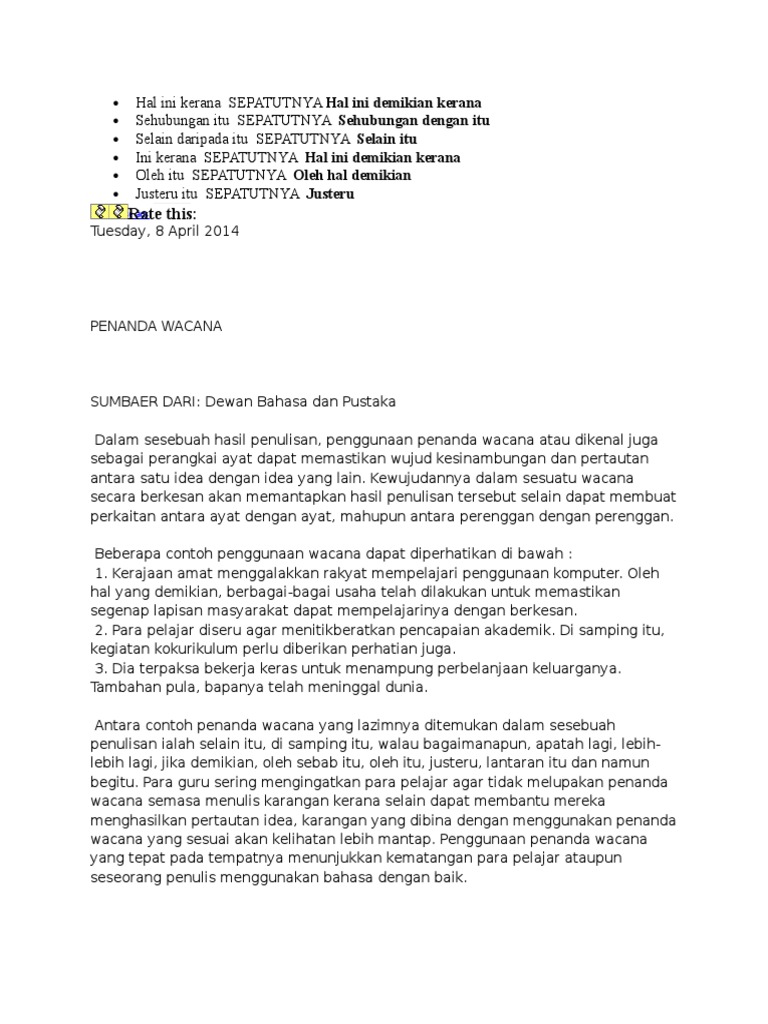 Hal ini bersangkut paut dengan g. Hal ini dikatakan demikian kerana kadang kala remaja menjadi bosan kerana ibu bapa tidak mahu bertolak ansur dan bersifat terbuka untuk menerima pendapat anak anak. Dalam bahasa melayu perkataan demikian ialah kata adverba. Penanda menghuraikan contoh a.