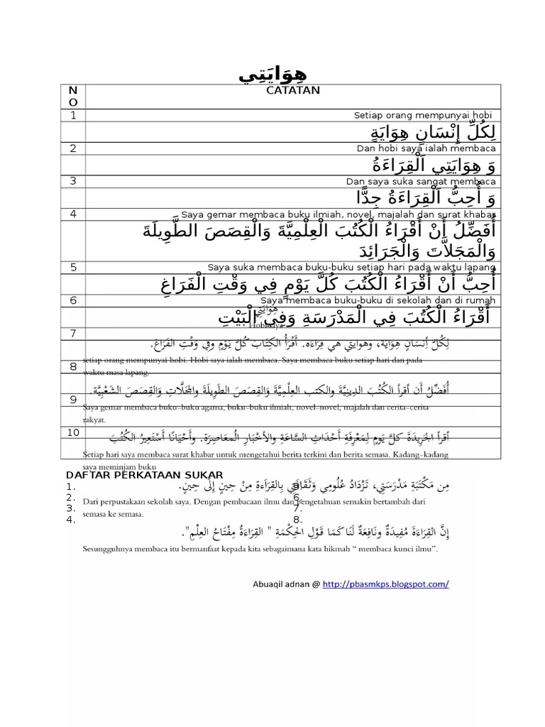 Hobi saya membaca buku dalam bahasa arab. Harini saya kena buat tajuk karangan pasal hobi saya nasib baik ada contoh karangan ni terima kasih cikgu goh. Dan ada pula postingan percakapan bahasa arab tentang hobi jika anda belum pernah membacanya silahkan kunjungi melalui tautan di atas. Saya membaca buku buku keislaman dan majalah majalah sains. Sample essay about my.