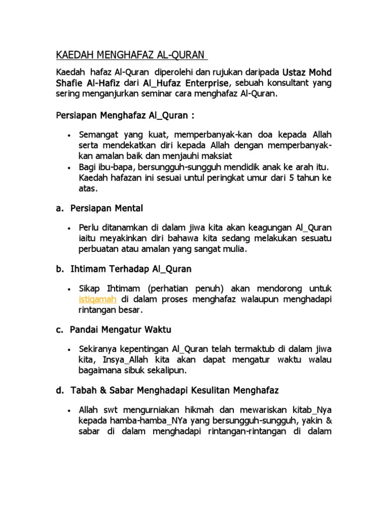 Kaedah hafazan al quran yang sistematik dan praktikal dalam melahirkan para huffaz yang rasikh. 2 1 kepentingan menghafaz al quran 10 2 2 sejarah pelaksanaan kaedah hafazan al quran 13 2 2 1 sejarah hafazan al quran di zaman rasulullah saw 15 2 2 2 sejarah hafazan al quran di zaman sahabat r a. Tanpa kaedah hafazan al quran yang bersistematik kesemua hafazan yang telah diperolehi akan hilang begitu sahaja dalam tempoh yang singkat daripada ingatan penghafaznya. Darul quran jakim jalan hamzah ampang pecah 44000 kuala kubu bharu selangor.