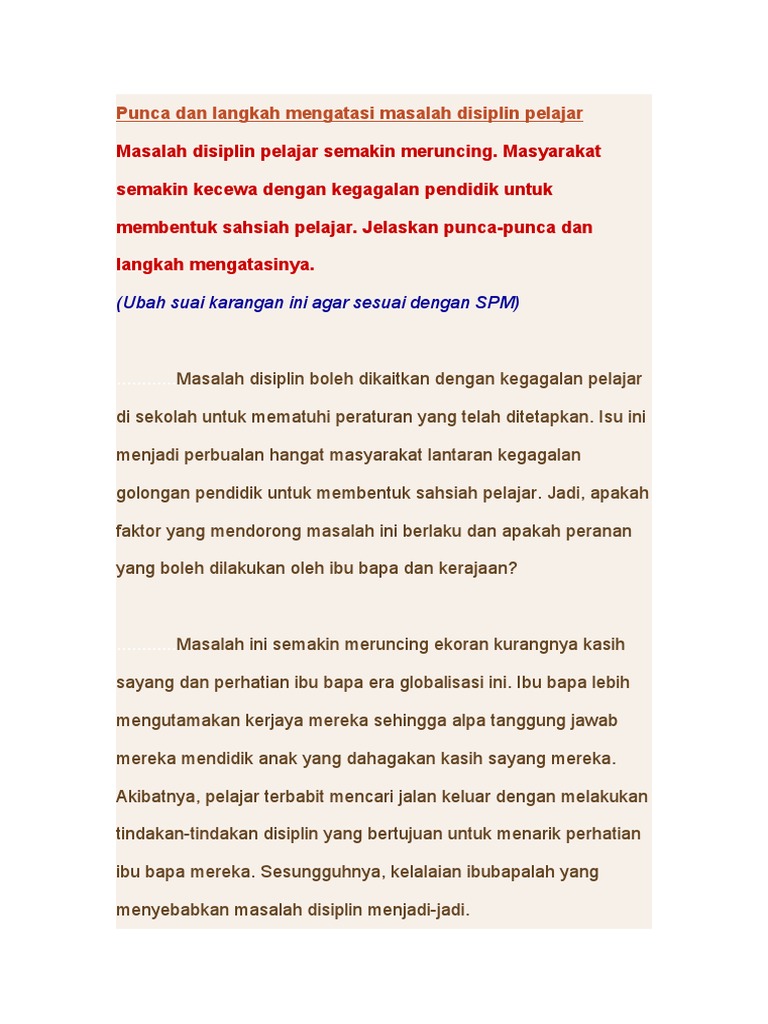 Paparan di televisyen dan surat khabar jelas menunjukkan bahawa masalah disiplin pelajar semakin meningkat setiap tahun. Contoh karangan bahasa melayu pt3 ini bukan sekadar untuk dibaca tetapi perhatikan setiap penggunaan ayat kata wacana penyelitan peribhasa dan gaya bahasa yangmenarik digunakan dalam karangan ini. Pada era globalisasi remaja sering dikaitkan dengan masalah disiplin. Pelajar pelajar di kawasan bandar menunjukkan peningkatan kadar jenayah yang lebih ketara berbanding dengan pelajar di kawsan luar bandar perkara ini memerlukan perhatian yang lebih serius daripada ibu bapa guru masyarakat dan pemimpin negara kerana mereka inilah generasi yang menentukan masa depan negara.