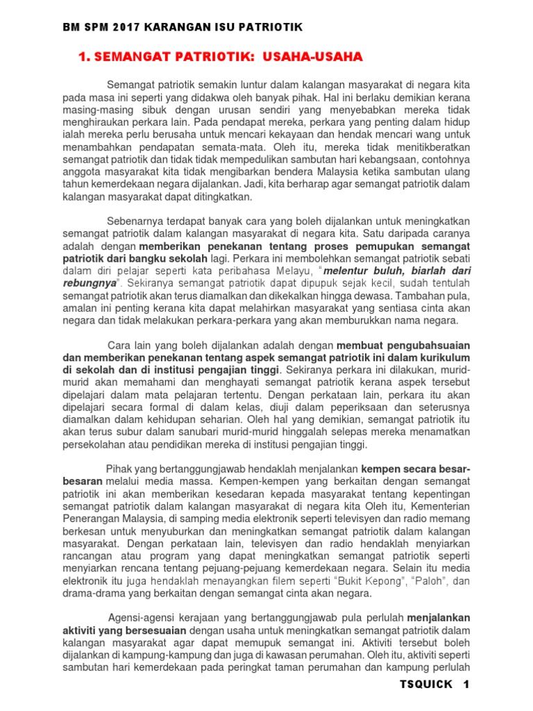 Karangan spm semangat patriotik. Kurang kesedaran tentang kepentingan semangat patriotisme pada masa hadapan 2. Sertai kursus intensif karangan a spm 2020 atas talian melalui laman web ini sekarang. Karangan spm semangat patriotik semangat patriotik dalam kalangan remaja semangat patriotik merujuk kepada perasaan cinta akan negara yang mendalam dalam diri seseorang. Maka berikut dikongsikan contoh karangan langkah memupuk semangat patriotik dalam kalangan masyarakat untuk panduan semua.