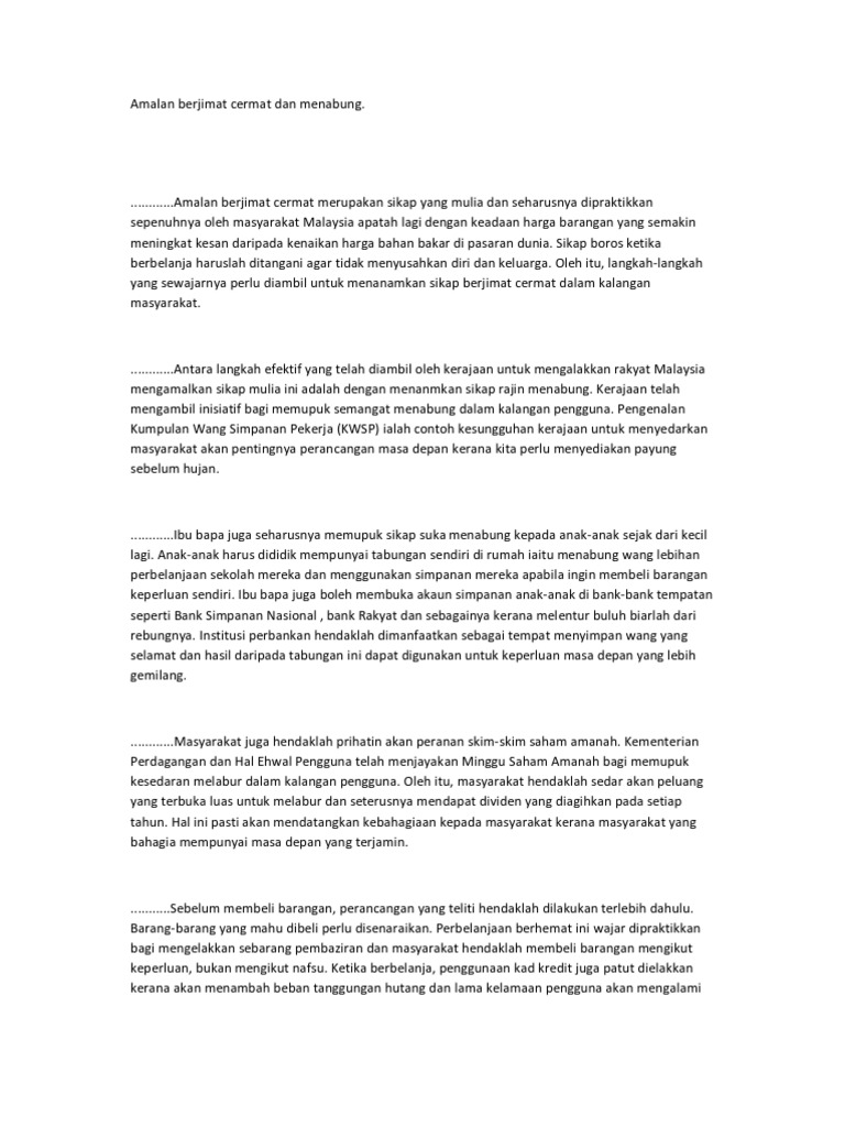 Sebagai panduan kepada pelajar berikut dikongsikan contoh karangan berjimat cermat amalan mulia.
