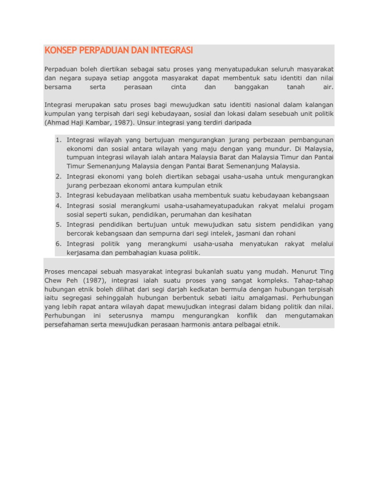 Konsep perpaduan sangat penting dalam usaha menjadikan malaysia sebagai sebuah negara yang teguh dan bersatu padu. Kejelekitan perpaduan dan integrasi rakyat dalam sebuah negara berbilang kaum sukar dicapai tanpa pendedahan awal yang berstrategik keintiman persefahaman semua pihak kepercayaan dan pegangan kukuh terhadap ajaran agama di samping menghayati dengan penuh keinsafan intipati dan kandungan tersurat dan yang tersirat dalam kesemua prinsip rukun negara penghayatan rukun negara untuk mencapai. Konsep integrasi etnik 1. Memperkenalkan konsep satu malaysia melalui pendidikan antara langkah2 untuk mengatasi masalah yang wujud dalam usaha mewujudkan perpaduan sosial ekonomi kebudayaan sistem persekolahan yang sama bagi semua bahasa.