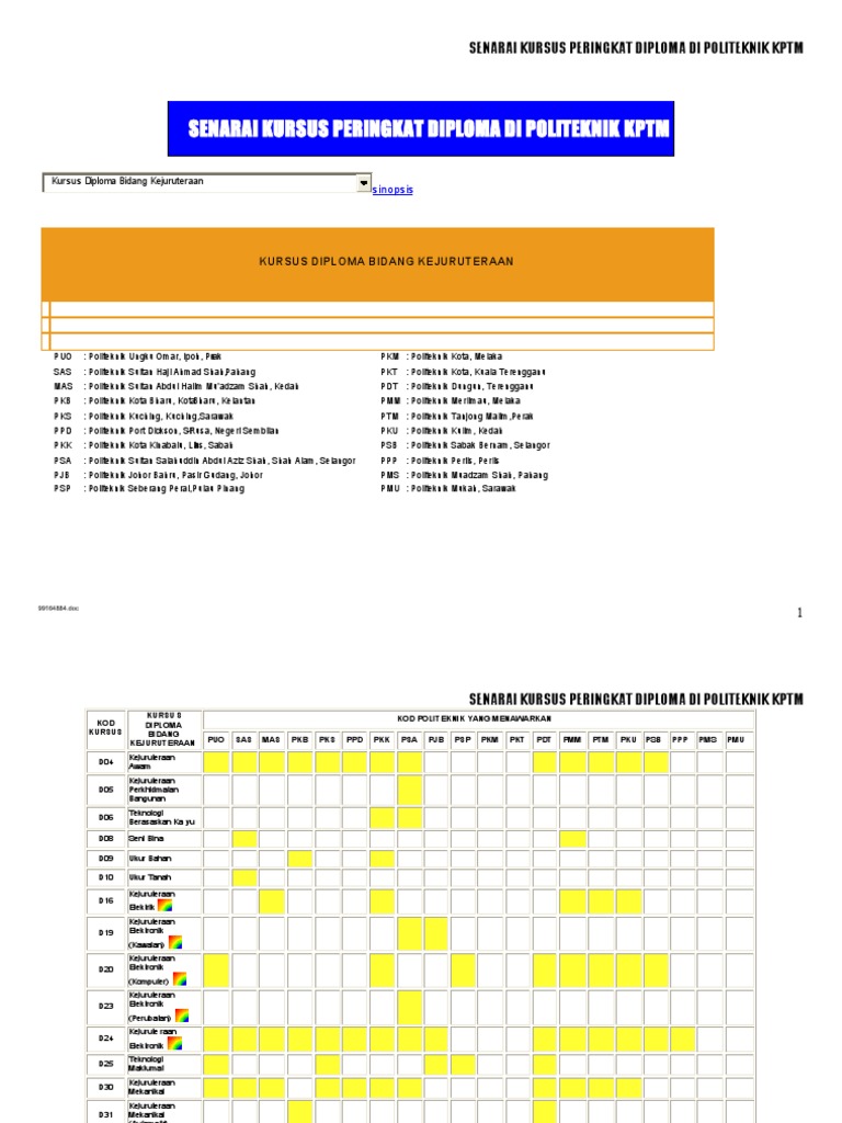 Di bawah adalah senarai politeknik dan kursus yang ditawarkan. Bagi menarik minat pelajar untuk menyertai politeknik banyak kursus kursus telah ditawarkan bersesuaian dengan permintaan industri politeknik juga telah banyak diwujudkan bagi menampung pelajar untuk mengikuti kursus di sini. 2016 2015 2014 id kursus. Sila klik pada isi borang sekiranya anda berminat mengikuti kursus yang ditawarkan.