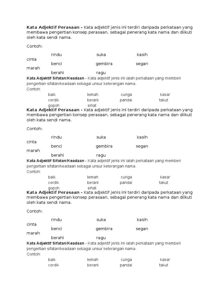 Empuk 1 latihan kata adjektiv 1 latihan kata arah 1 latihan kata banyak makna 1 latihan kata bilangan 2 latihan kata ganda 4 latihan kata ganda tahun 6 11 latihan kata ganti nama diri 1 latihan kata hampir sama makna 4 latihan kata hampir sama makna tahun 4 1 latihan kata hampir same erti 1 latihan. 10 pelajar tahun enam waja sangat dan hormat kepada guru guru mereka. Kata adjektif perasaan contoh. Kata adjektif perasaan contoh.