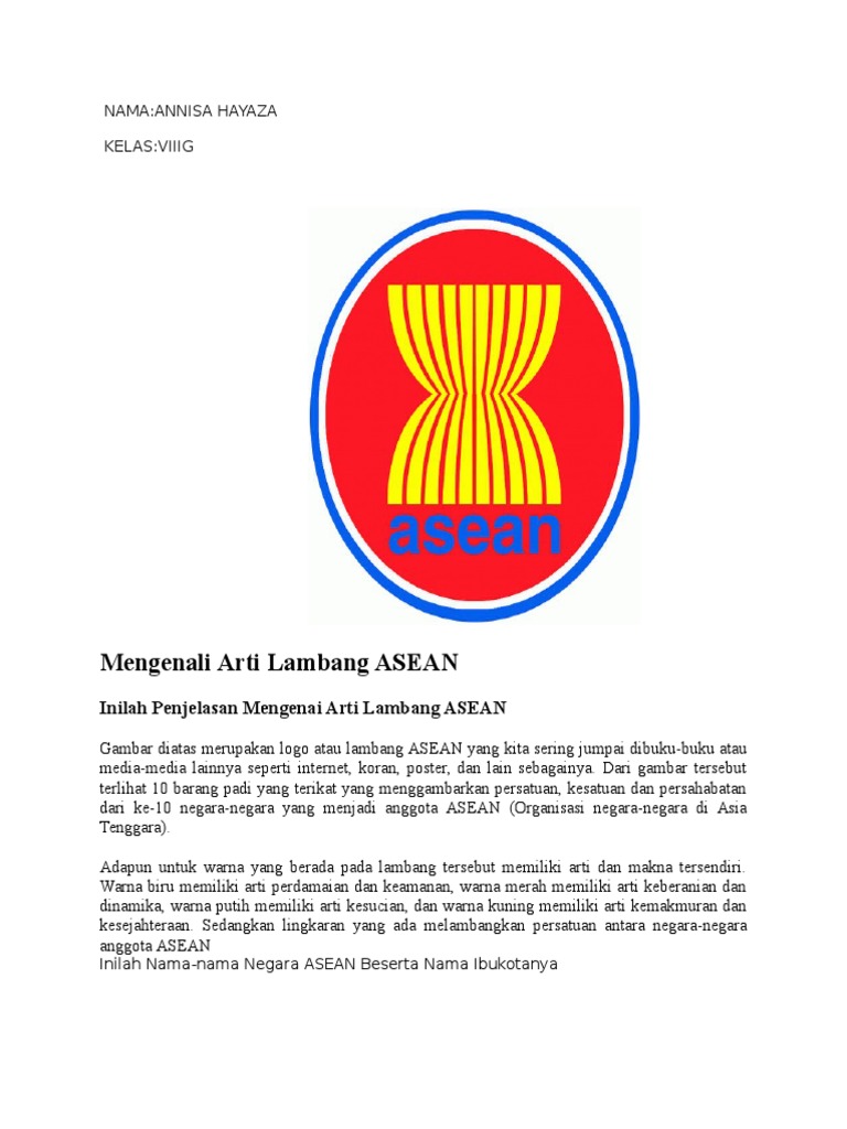 Dianggotai oleh negara asia tenggara iaitu malaysia indonesia singapura thailand dan filipina 1967 berunei darulsalam 1984 vietnam 1995 laos dan myanmar 1997 dan kemboja 1999 dua negara pemerhati iaitu timor leste dan papua new guinea. Persatuan negara negara asia tenggara asa setelah mencapai kemerdekaan negara kita dan juga negara negara serantau diancam hebat oleh pengaruh komunis. Lambang asean ialah lambang persatuan negara negara asia tenggara yang diguna pakai pada julai 1997 bersama sama dengan bendera asean walaupun lambang semasa telah digunakan selama bertahun tahun garis panduan rasmi telah diterima pakai pada mesyuarat ke 6 majlis penyelarasan asean acc di hanoi 8 april 2010. Dari jumlah itu 10 negara di antaranya adalah negara anggota asean sementara satu negara sisanya adalah timor leste yang belum tergabung dengan asean secara resmi.