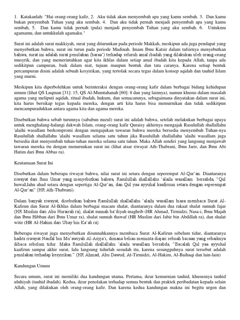 ب س م الل ه الر ح م ن الر ح ي م. Hai orang orang kafir aku tidak akan menyembah yang kamu sembah dan kamu bukan penyembah tuhan yang aku sembah. ق ل ي ا ي ه ا ال ك ف ر و ن qul yā ayyuhal kāfirụn katakanlah muhammad wahai orang orang kafir. Surat al kafirun ini merupakan surat yang ke 109 dengan jumlah ayat 6.