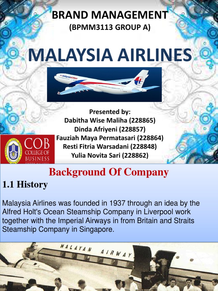 Malaysia airlines company background. Malaysia airlines berhad mab previously known as malaysia airline system mas is the national flag carrier of malaysia based in kuala lumpur. Introduction 1 0 background of malaysia airlines malaysia airlines system berhad is also known as mas in short. Company profile page for malaysia airlines bhd including stock price company news press releases executives board members and contact information. Originally founded in 1947 as malayan airways malaysia airlines operates a network of scheduled international and domestic services as part of a broader group of airlines that include its wholly owned subsidiaries firefly and maswings.