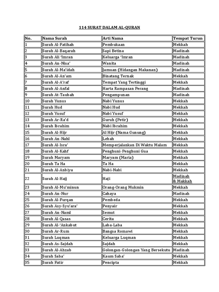 ب س ـــــــــم ٱلله ٱلر ح ـم ـ ن ٱلر ح ـــــــيم الل ه م ص ل ع ل ى م ح م د و ع ل ى آل م ح م د. Surat ke nama surat jumlah ayat kategori juz. Artikel yang menyajikan daftar surat dalam al quran dan jumlah ayatnya yang berisi 114 surat dan 6236 ayat disajikan dalam bentuk tabel sehingga akan memudahkan anda dalam mengetahui nama nama surat dalam quran dan jumlah ayatnya secara lengkap dan terperinci. 114 surat dalam al quran assalamualaikum warahmatullahi wabarakatuh kembali lagi dengan yuksinau co id yang mana pada kesempatan ini kami akan membahas mengenai 114 surat dalam al quran yakni meliputi jumlah nama ayat beserta artinya dan tempat turun ayat ayat tersebut.