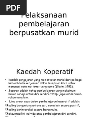 Pdf on jan 1 2013 kamarul azmi jasmi and others published pendekatan pengajaran dan pembelajaran berpusatkan pelajar dalam kecemerlangan guru cemerlang pendidikan islam dan guru di sekolah. Strategi yang berpusatkan guru juga dikenali sebagai pengajaran langsung. Strategi pemusatan murid di bawah strategi berpusatkan murid ini murid memainkan peranan yang penting dalam proses pembelajaran. Mengikut strategi ini murid digalakkan melibatkan diri secara aktif dalam aktiviti pembelajaran mereka.