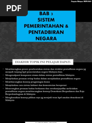 Bab 3 sistem pemerintahan dan pentadbiran negara demokrasi berparlimen sistem demokrasi berparlimen malaysia mengamalkan sistem demokrasi berparlimen di bawah pentadbiran raja berperlembagaan dengan seri paduka baginda yang di pertuan agong sebagai ketua negara. Bab 3 sistem pemerintahan dan pentadbiran negara latar belakang ciri negara berbentuk persekutuan seperti malaysia. Pengajian malaysia bab 3 sistem pemerintahan pentadbiran negara bentuk pemerintahan islam. Sistem pemerintahan dan pentadbiran negara demokrasi berparlimen demokrasi berparlimen kerajaan demokrasi berparlimen diperkenalkan di malaysia buat pertama kalinya apabila majlis persekutuan federal council ditubuhkan pada tahun 1909.