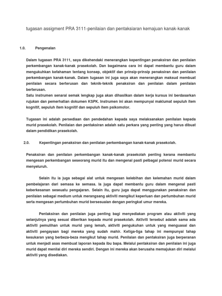 Pentaksiran dan penilaian kanak kanak prasekolah. Melalui pemerhatian kita dapat menjalankan penilaian yang tidak bersifat bias terhadap kanak kanak. O menurut nor hashimah hashim dan yahya che lah 2005 menyatakan pemerhataian ialah memerhati secara sistematik tingkah laku aspek perkembangan aspek pertumbuhan dan pencapaian kanak kanak. Secara ringkasnya pentaksiran merupakan satu proses pemerhatian yang melibatkan beberapa langkah utama dalam proses pengumpulan tentang perkembangan dan kemajuan kanak kanak dari aspek psikomotor kognitif dan afektif yang dilaksanakan secara berterusan dan tidak formal dan bertujuan untuk mendapatkan maklumat yang tepat. Pra3111 pentaksiran dan penilaian kemajuan kanak kanak 9 2 peranan dan tanggungjawab guru guru prasekolah sebagai etika pentaksiran adil dalam membuat penaksiran mengambil kira perbezaan individu dari aspek keperluan khas tekal dalam melaksanakan penaksiran menjaga kerahsiaan untuk maklumat maklumat yang sulit memberi maklum balas yang betul kepada ibu bapa terhadap.