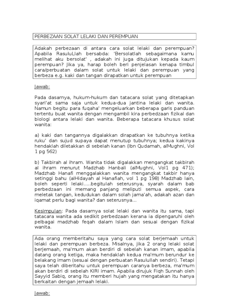 Tidak ada alasan apa pun yang menghalangi adanya distribusi beban sosial antara laki laki dan perempuan untuk kemaslahatan publik bagi keluarga dan masyarakat. Dalam ayat di atas menjelaskan posisi dari wanita muslimah menurut islam dan laki laki muslim sebagai berikut. Keadaan ini berbeza dengan lelaki yang disunatkan supaya merenggangkan dua sikunya dari dua rusuk dan mengangkat perutnya dari kedua pahanya al baihaqi 2 232 meriwayatkan nabi muhammad saw telah berjalan di kawasan dua orang perempuan yang sedang bersembahyang lalu baginda bersabda apabila kamu berdua sujud maka himpunkan rapatkan sesetengah. Adapun perbedaan antara wanita dan laki laki dalam islam ada tujuh yaitu pertama aqiqah bagi anak laki laki dua ekor kambing dan bagi anak perempuan satu ekor.
