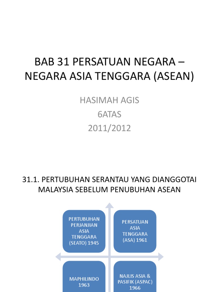 ˈ ɑː s i ɑː n ah see ahn ˈ ɑː z i ɑː n ah zee ahn ialah sebuah pertubuhan antara kerajaan serantau yang terdiri daripada sepuluh negara di asia tenggara yang menggalakkan kerjasama antara kerajaan dan memudahkan integrasi ekonomi politik keamanan ketenteraan pendidikan dan sosial budaya di antara anggotanya dan negara. Asean ialah sebuah pertubuhan di rantau asia tenggara yang menujukan untuk memesatkan pertumbuhan ekonomi kemajuan sosial dan pembangunan budaya dalam kalangan anggotanya dan menggalakkan keamanan serantau. 10 negara asia tenggara telah membentuk organisasi asean yang bekerjasama di bidang politik ekonomi dan sosial budaya. Persatuan negara negara asia tenggara asean muryuliana sharifah fatimah azzahrah nur hidayah 2.