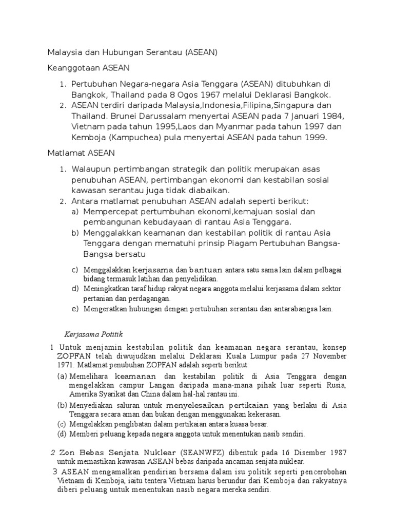 Persatuan negara negara asia tenggara asean ditubuhkan pada 8 ogos 1967 melalui deklarasi bangkok 2. Sejak malaysia mencapai kemerdekaan terdapat tiga pertubuhan serantau yang telah dibentuk dan disertainya iaitu asa pada tahun 1961 maphilindo pada tahun 1963 dan asean pada tahun 1967. Organisasi ini bertujuan untuk meningkatkan. Penglibatan peranan dan sumbangan peringkat serantau persatuan negaranegara asia tenggara asean mengapa malaysia melibatkan.