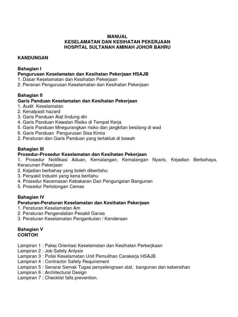 Adalah menjadi polisi keselamatan dan kesihatan pekerjaan syarikat abc sedap sdn bhd iaitu kami bersama sama para pekerja abc sedap sdn bhd akan selalu berusaha untuk mengekalkan dan memastikan tempat bekerja kami berada di dalam keadaan yang selamat dan sihat pada sepanjang masa. Aras 5 kaunter utama blok d4 kompleks d pusat pentadbiran kerajaan persekutuan 62530 putrajaya. Peranan keselamatan dan kesihatan pekerjaan di malaysia telah bermula sejak 120 tahun yang lalu iaitu pada akhir abad ke 19. Manual keselamatan dan kesihatan pekerjaan hospital sultanah aminah johor bahru.