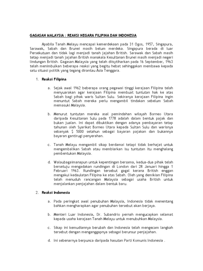 Bagi sabah pula sebelum pengumuman tunku abdul rahman untuk membentuk malaysia belum wujud lagi parti parti politik. Pada 11 februari 1963 dr. Pada peringkat awal pemerintah indonesia tidak menunjukkan sebarang reaksi terhadap pembentukan malaysia. Pada peringkat awal pemerintah indonesia tidak menunjukkan sebarang reaksi terhadap pembentukan malaysia.