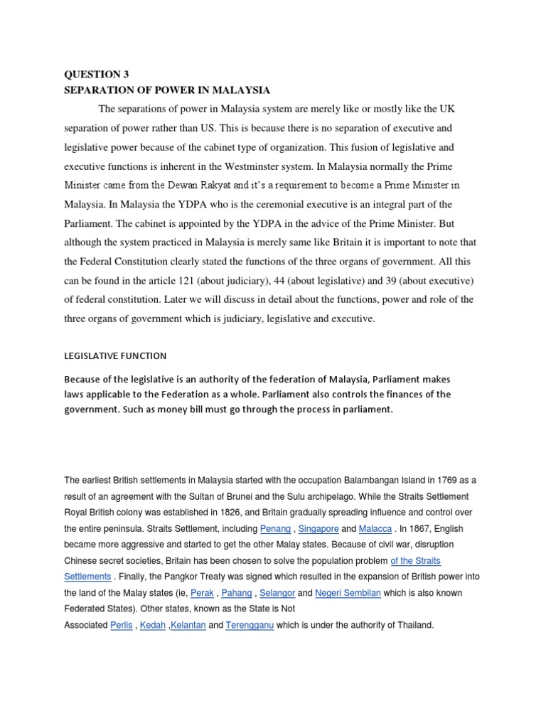 That s not the question the question is to be two or to be three1 the logic of separation in its simplest requires the making of two divisions from one whole. The doctrine of separation of powers doctrine in malaysia is not like the original because it emphasizes the relative power or dependency between the three bodies. Separation of power in malaysia 1 separation of power in malaysia bn government change the rule nasri talking that cases before the courts were not intervened by any quarters and that there were cases where the judgments were not in favour of the executive do not equate to the doctrine in practice. The executive is a body which has the power to govern the country either in the federal or state level.