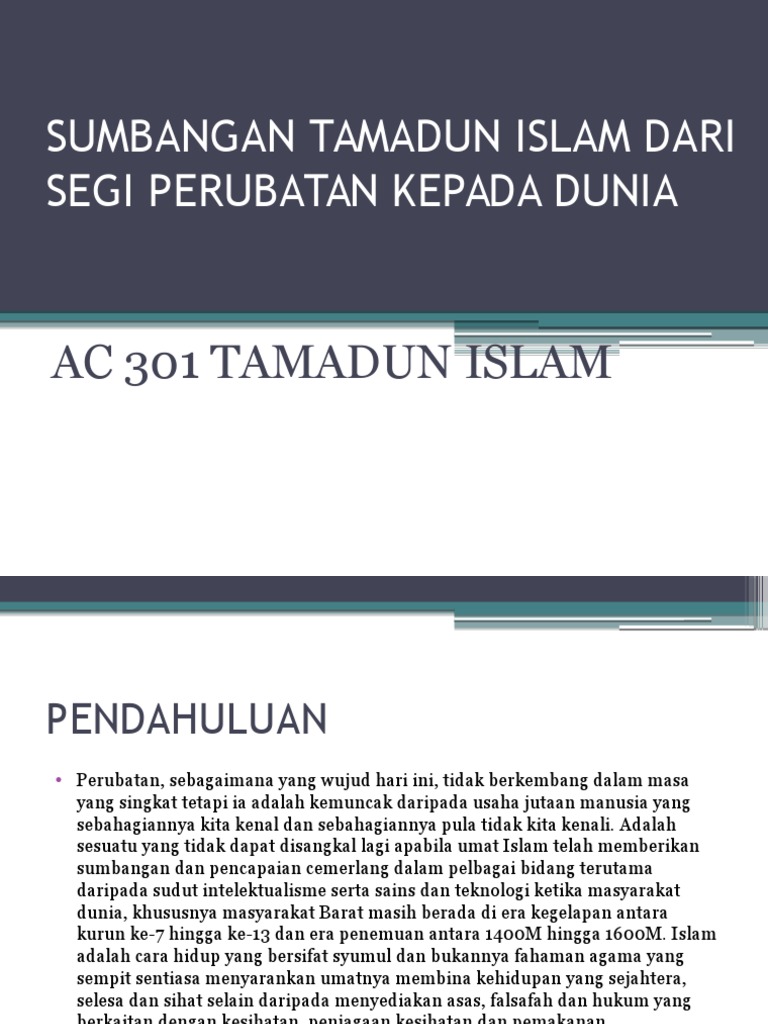 Cuma dengan kedatangan islam yang menjadi titik tolak awal ke arah pembentukan tamadun baru dunia bidang ini lebih menonjol kepentingan dan keperluannya. Mpu3123 tamadun islam dan tamadun asia. Diharapkan penulisan ini dapat menonjolkan kecemerlangan tamadun islam dan sumbangan para pengarang kitab al tibb al nabawiyy dalam memperkenalkan masyarakat dunia kepada perubatan nabi yang merupakan warisan penting bagi umat islam dalam mencapai kesihatan dan kesejahteraan dengan berpandukan hadis nabi. Sumbangan islam dalam memodenkan tamadun barat dilupakan ataupun disenyapkan begitu sahaja sedangkan inter ak si antara islam dan barat telah berlaku lebih awal dari renaissance 1400 1650 islam.