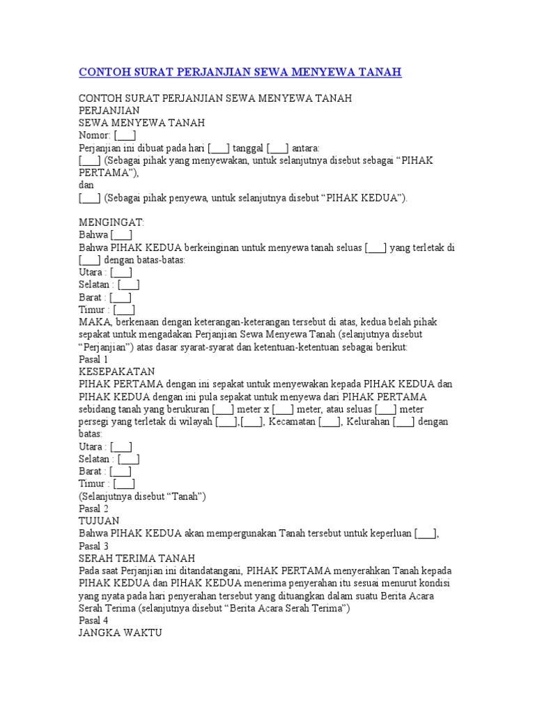 Surat perjanjian sewa tanah malaysia. Perjanjian tersebut perlu mengemukakan terma dan persetujuan antara pihak yang terbabit. Contoh surat perjanjian sewa menyewa tanah yang bertanda tangan di bawah ini. Sewaan adalah agak piawai tetapi perlu sentiasa merangkumi klausa untuk sewa bulanan sewa tarikh adalah kerana tempoh pajakan tanggungjawab penyewa dan tuan tanah dan bagi mana mana fasal yang tidak diikuti. Sejak perjanjian pengalihan itu ditandatangani oleh pihak pertama pihak kedua dan pihak ketiga maka pihak ketiga yang menerima pengalihan itu wajib membayar harga sewa dan memenuhi kewajiban kewajiban lain yang diatur dalam perjanjian ini dan setuju atas perubahan perubahan harga sewa uang jaminan jangka waktu sewa serta persyaratan khusus lainnya baik yang diatur dalam perjanjian ini.