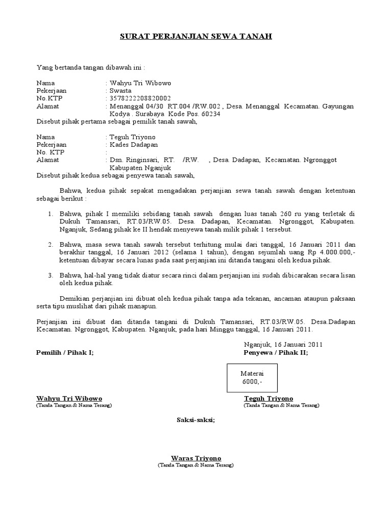 Wahyu tri wibowo pekerjaan. Contoh surat perjanjian sewa tanah surat perjanjian merupakan hal yang sangat penting jika sedang dalam proses sewa menyewa baik itu sewa ruko rumah ataupun tanah. Terkait font huruf ataupun tata teksnya tidak ada aturan baku yang mengatur. Format surat perjanjian sewa tanah.