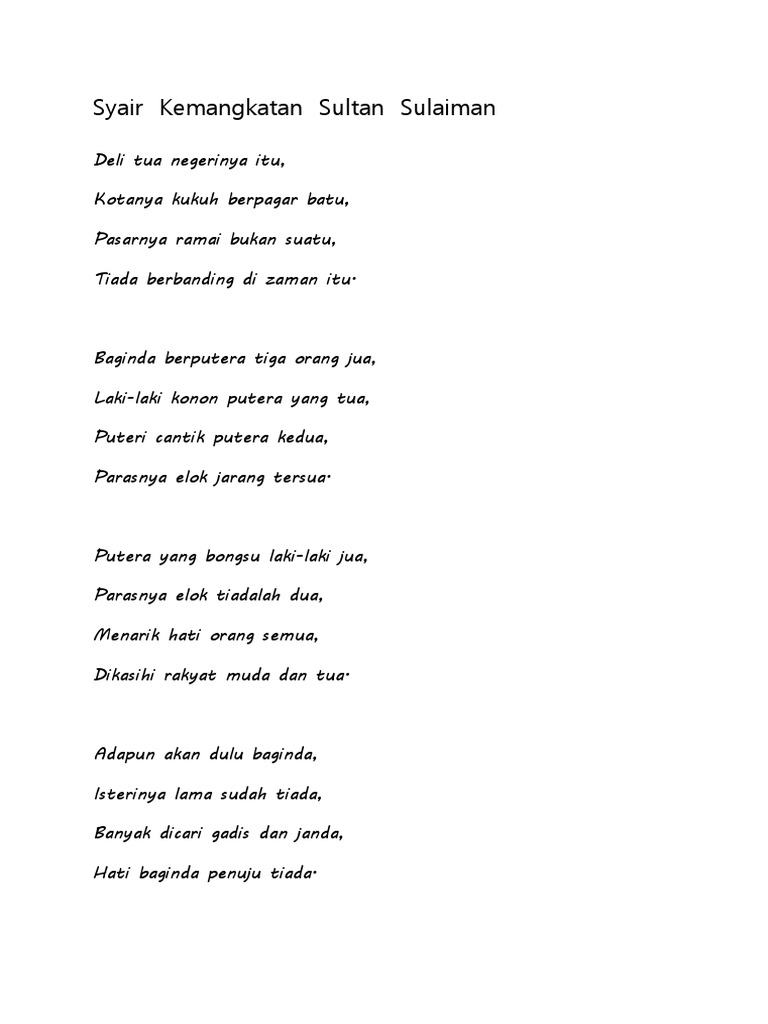 Syair kemangkatan sultan sulaiman. Syair kemangkatan sultan sulaiman peta minda 1. Komsas soalan 2 d saharuddin. Puisi tradisional syair makna riak saharuddin abdullah. Kemakmuran negeri deli tua tiada bandingannya pasarnya banyak serta meriah dan kotanya kukuh.