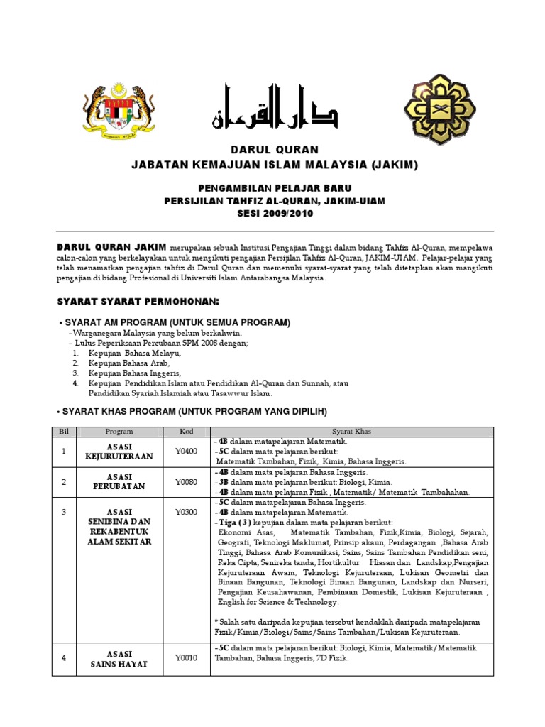 Program program pengajian ijazah sarjana muda pengajian quran sunnah dengan kepujian secara kerjasama dengan usim pensijilan tahfiz al quran jakim iium sijil asas tahfiz al quran. Berikut dikongsikan panduan permohonan diploma tahfiz al quran yang dipetik dari laman web rasmi darul quran. Sehubungan itu jika membawa barang yang tidak dibenarkan tindakan keras akan diambil. Tamat tahun 6 sk srk sri sru atau setaraf dengannya.