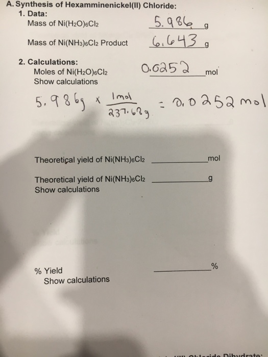 Synthesis of hexaamminenickel ii chloride. Synthesis or rather cooking. 11 calculate the percent by mass of nh3 in the three samples. Find sigma aldrich 255807 msds related peer reviewed papers technical documents similar products more at sigma aldrich. Hexamminenickel ii chloride synthesis 2 go to a fume hood for the next step.