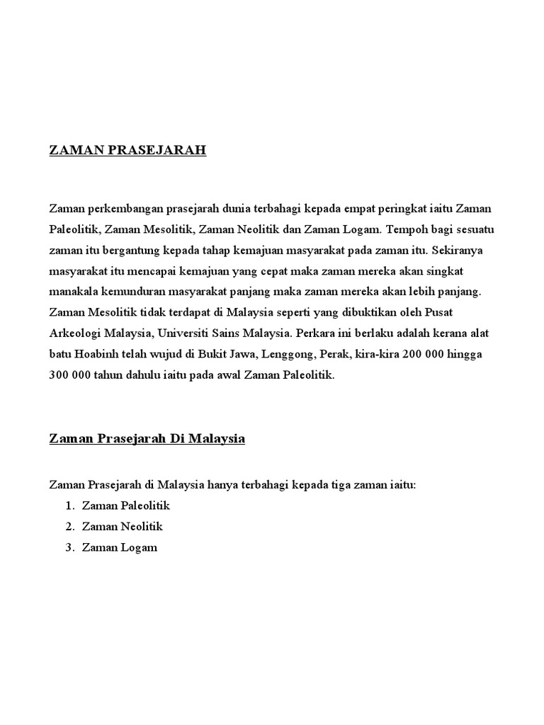Tapak tapak arkeologi zaman prasejarah di malaysia. Zaman arkeologi prasejarah 1820 hingga 1920 arkeologi. Masa berakhirnya prasejarah bagi setiap bangsa tidak sama karena adanya perbedaan masa dalam pengenalan tulisan. Penemuan arkeologi di malaysia seperti sabah ialah di bukit tengkorak di semporna tingkayuh di kunak masuli di lahad datu. Bandaraya melaka dan georgetown pulau pinang diiktiraf sebagai tapak warisan dunia oleh unesco pada tahun 2008.