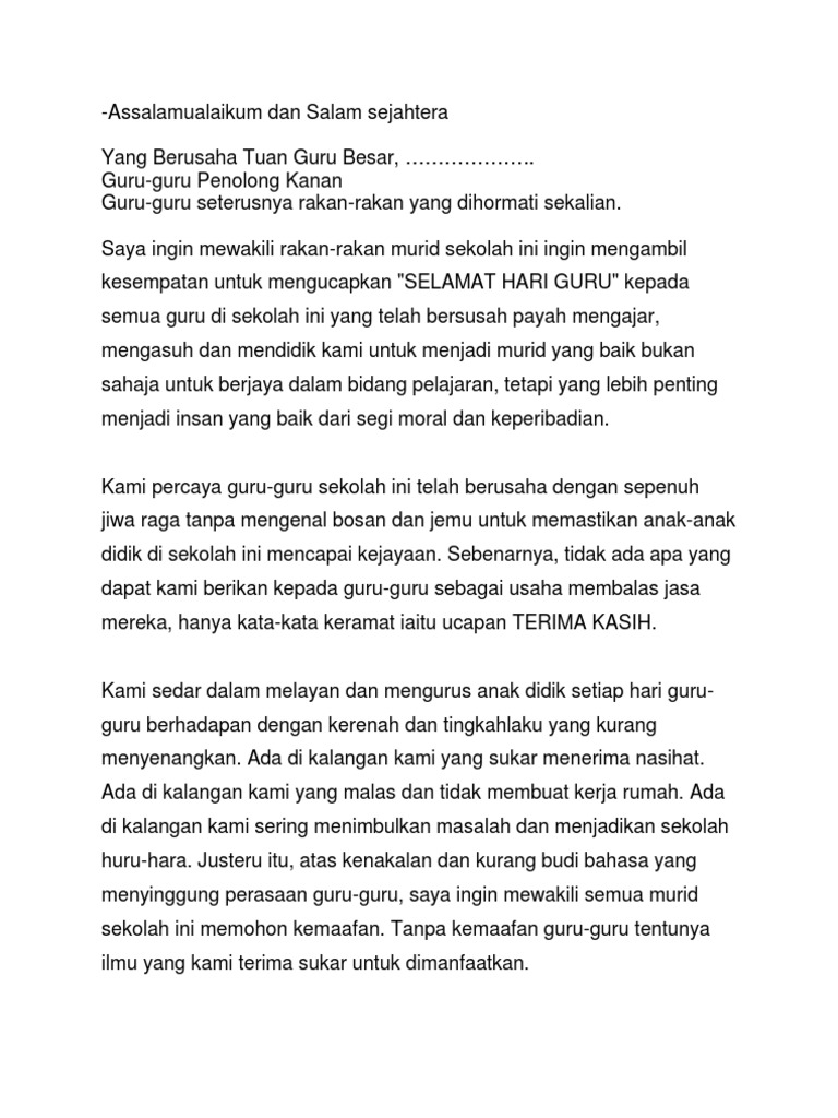 Semoga tuhan selalu mencurahkan rahmat dan kasih sayang kepada cikgu. Maka dari itu sudah sepantasnya kita sebagai muridnya mengucapkan kata kata terima kasih kepada guru kita. Sebenarnya dengan mengucapkan kata terimakasih gambaran karakter orang tersebut bisa diketahui meskipun hanya dengan kata kata kecil yang dianggap sangat sepele. Ucapan terima kasih tidak mudah bagi semua orang untuk mengucapkan terima kasih karena kebanyakan orang akan merasa gengsi atau malu ketika mau mengucapkan kata terima kasih kepada seseorang yang telah menolongnya.