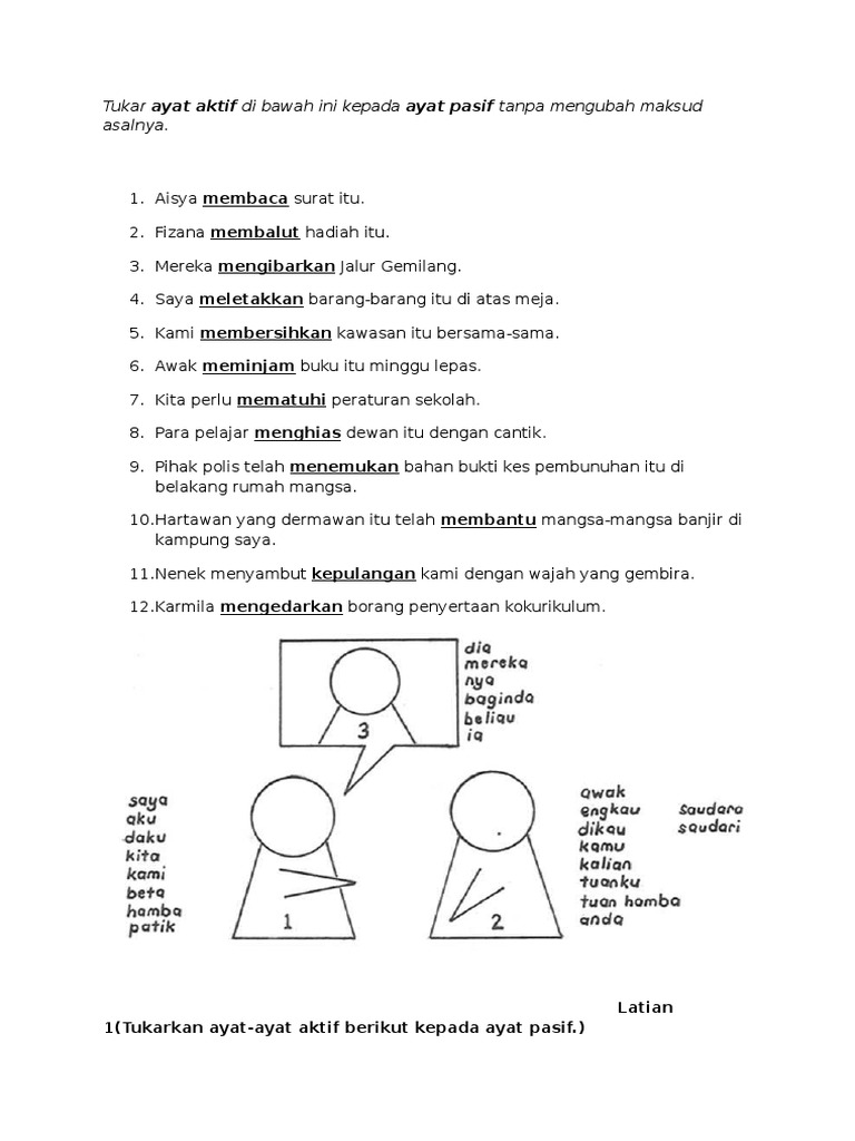 Ayat pasif kepada ayat aktif tukarkan ayat ayat pasif di bawah kepada ayat aktif tanpa mengubah maksud asalnya. Tukarkan ayat ayat aktif berikut kepada ayat pasif. Guru disiplin yang garang itu sedang memarahi pelajar lelaki yang tidak memakai. Contoh menukarkan ayat pasif kepada ayat aktif tukarkan ayat ayat di bawah kepada ayat aktif.