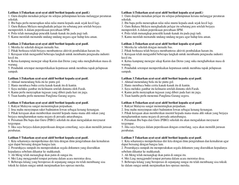 Tukarkan ayat ayat aktif berikut kepada ayat pasif. Guru disiplin yang garang itu sedang memarahi pelajar lelaki yang tidak memakai. Ibu bapa perlu menerapkan nilai nilai murni kepada anak sejak kecil lagi. Contoh menukarkan ayat aktif kepada ayat pasif tukarkan ayat ayat di bawah kepada ayat pasif. Pak abu telah membaiki mesin tebu itu.